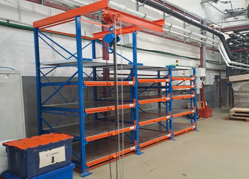 Подходят для хранения обслуживания и ремонта легких грузов, таких как небольшие штампы, формы для литья, матрицы, поковки, детали и узлы Благодаря выкатным платформам стеллаж обеспечивает удобство доступа к хранимым предметам. Конструкция со строенной талью.