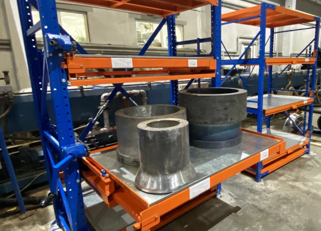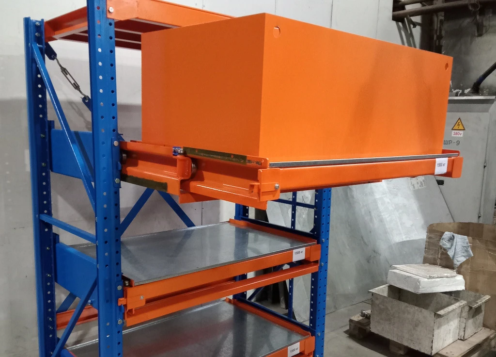 Стеллажи для хранения тяжелой оснастки, штампов и форм для литья с нагрузкой до 1400 кг. Встроенный механизм защиты от одновременного выдвижения уровней. Фиксация полок в выдвинутом и задвинутом состоянии.